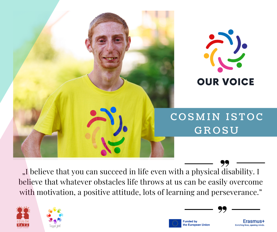 Cosmin Istoc Grosu shared his thoughts on the significance of perseverance, motivation, and learning, showing that even the greatest obstacles can be overcome. Born with physical disadvantages, Cosmin wants to demonstrate to his peers that success is possible despite physical challenges.