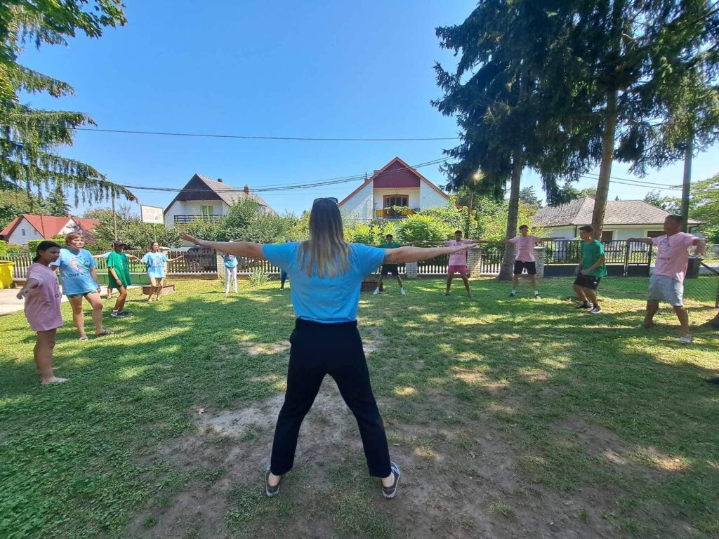 On Monday, after creating the rules together, our lead trainer took us on an inner journey to explore our perceptions. Later, with the help of youth facilitators, we continued to work in small groups, guided by our trainer. We worked on ourselves and got to know each other, while of course splashing around in Lake Balaton and playing lots of sports: badminton and football. In the evening the camp turned into a garden cinema. We watched the film „Saving Casa Hogar” together.